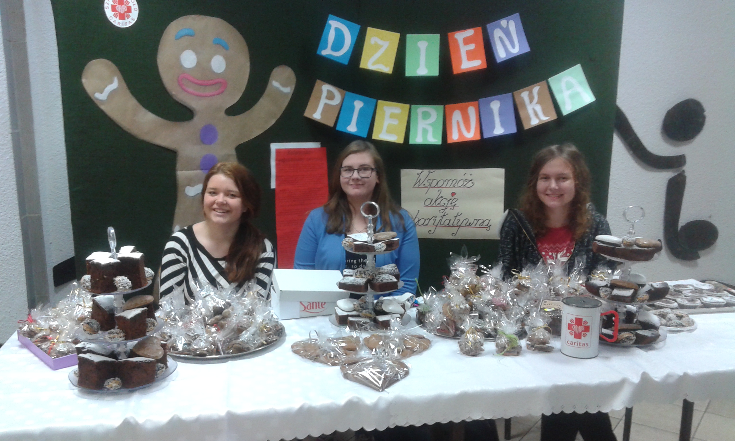W imieniu własnym i całego Szkolnego Koła Caritas chciałabym serdecznie podziękować wszystkim, którzy przyłączyli się do akcji "Dzień Piernika" kupując wypieki z naszego stoiska. Akcję uznajemy zdecydowanie za udaną! Uzbierane 380 złotych przeznaczyliśmy na zakup potrzebnych rzeczy do Szlachetnej Paczki. Mamy nadzieję, że to nie ostatnia akcja angażująca tyle osób, którym nie jest obojętny los drugiego człowieka!