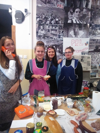 Oprócz wspaniałego jedzenia, uczniowie zadbali również o wystrój swoich stolików na których oferowali swoje pyszności. Szczególnie przykuwały uwagę dwa stoliki, w stylu PRL nieco siermiężnym i "kryzysowym" z towarem "spod lady" (świetna swojszczyzna nie była atrapą z wystawy)! Dziewczyny z I b LO zadbały również o ubiór z epoki. Gratulację za odwagę i dystans! Również wystrój stolika klasy II e LO został dopracowany, tematyczny plakat, książki związane z Polską do których można było zaglądnąć w czasie konsumpcji. Również estetyka pozostałych stolików była godna uwagi.