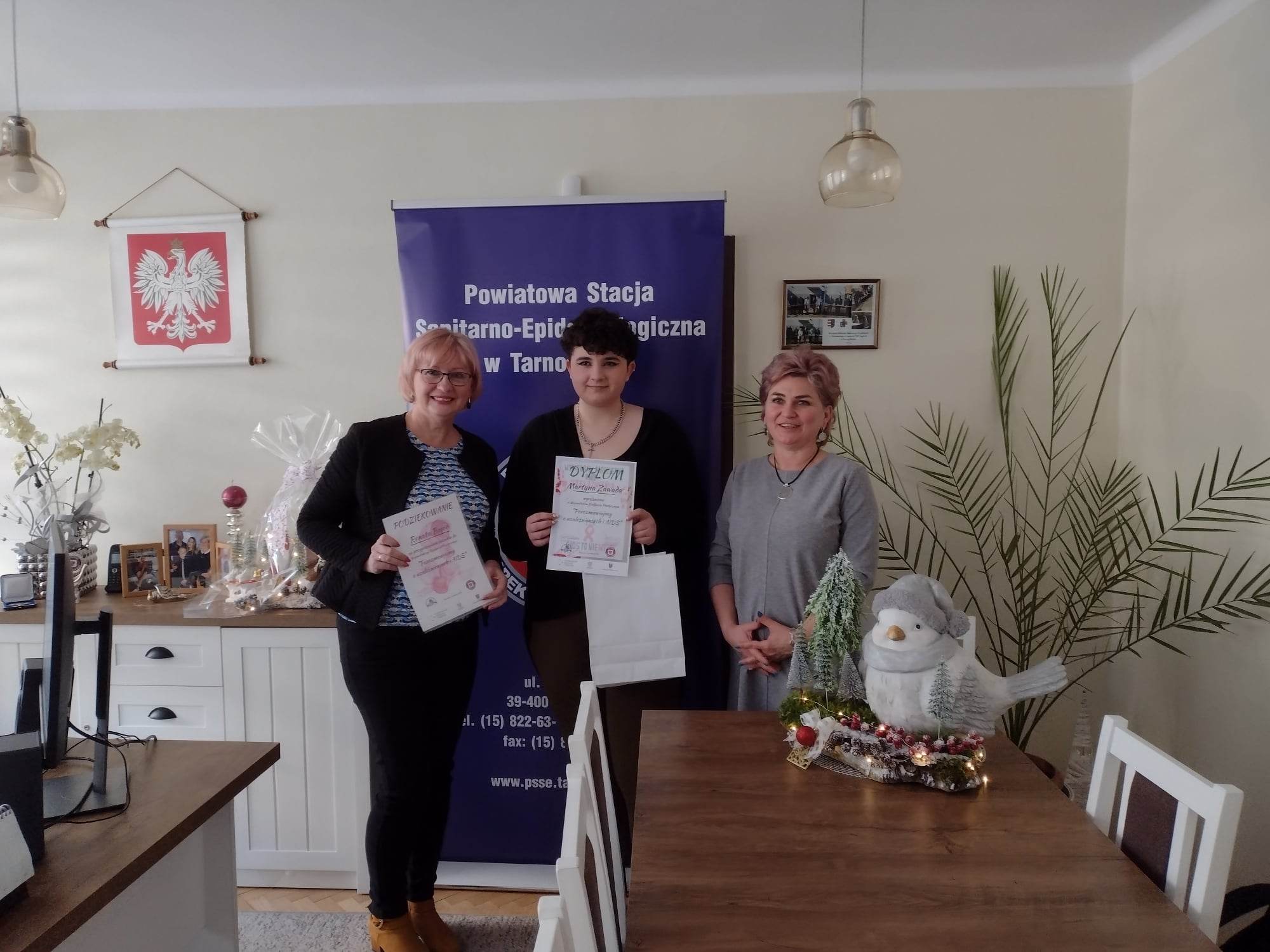 Tym razem dyplom i drobny upominek z rąk dyrektor Powiatowej Stacji Sanitarno- Epidemiologicznej w Tarnobrzegu, pani Małgorzaty Michalskiej - Szymaszek otrzymała Martyna Zawada. Jej praca została dostrzeżona i wyłowiona przez jury z 293 innych nadesłanych przez młodzież z województwa podkarpackiego, co tym bardziej nas cieszy i napawa dumą! Martynie dziękujemy, serdecznie gratulujemy i życzymy by dalej swój talent rozwijała, artystycznie patrzyła na świat oraz malowała go swoją wyobraźnią.