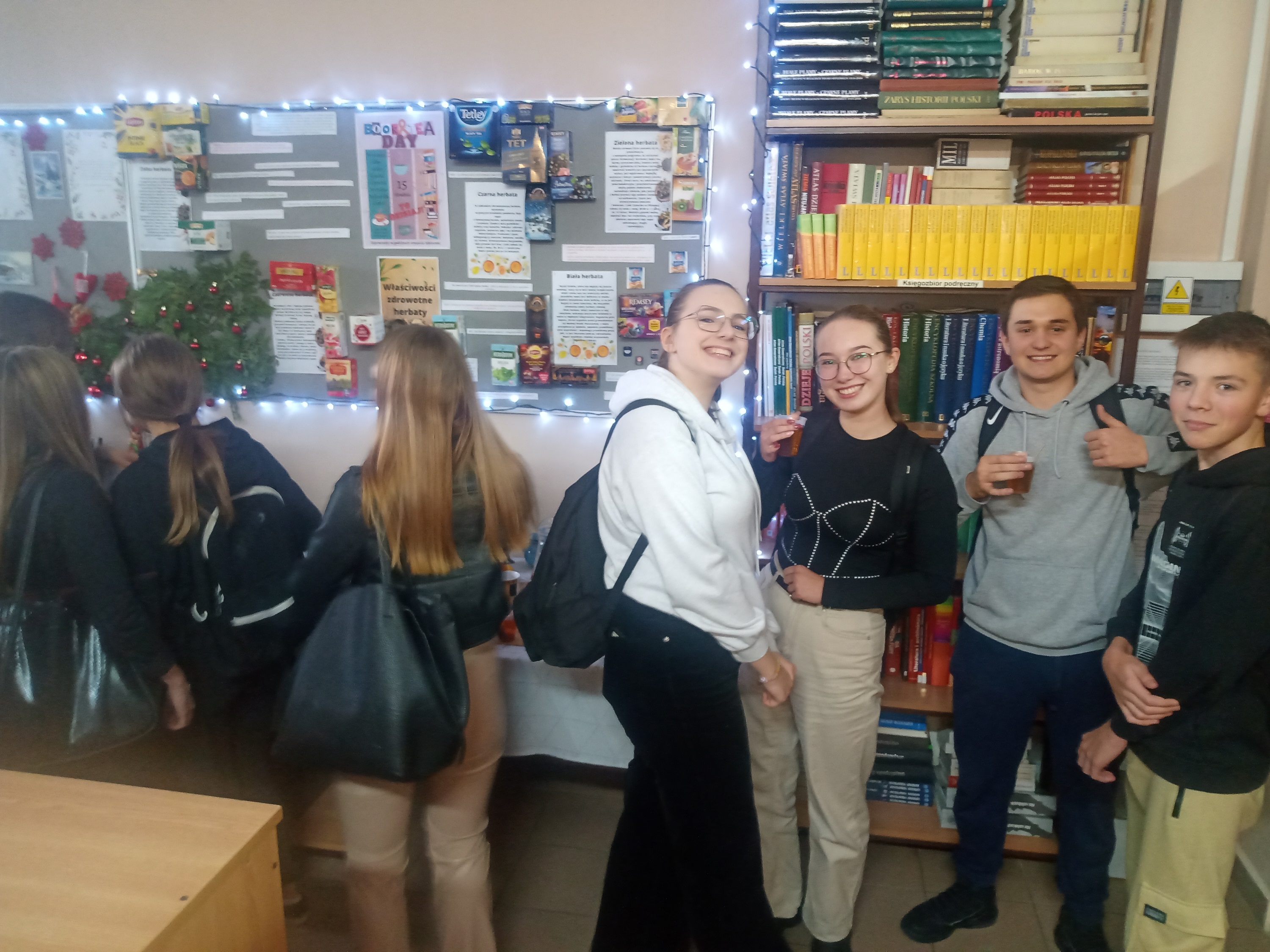 15 grudnia to Międzynarodowy Dzień Herbaty i z tej okazji w bibliotece szkolnej zorganizowany został Book&Tea Day. W ten mroźny dzień w specjalnie przygotowanym do tego miejscu można było zasiąść z książką w dłoni i delektować się pyszną herbatką. Czytelnicy mieli do wyboru herbatę czarną, zieloną, białą, owocową czy aromatyzowaną przyprawami i owocami lub samym miodem. Na tablicy ściennej tablicy zamieszczone zostały informacje dotyczące zdrowotnych właściwości poszczególnych gatunków herbat. Zaprezentowane zostały również ciekawostki dotyczące tego niezwykłego i lubianego przez wielu napoju.