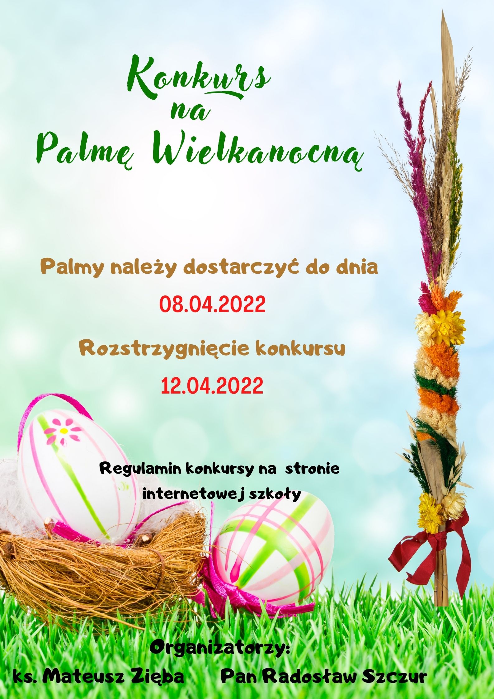 Konkurs ma charakter otwarty. Uczestnicy konkursu mają za zadanie wykonać tradycyjne palmy wielkanocne. Polecana technika wykonania: materiały naturalne: żarnowiec, bukszpan, bazie, suche kwiaty, wydmuszki jak i krepa, wstążki, bibuła itp. Uwaga: fabrycznie wyprodukowane, gotowe palmy nie będą brane pod uwagę, przy ocenie w ramach konkursu. W konkursie mogą uczestniczyć wszysycy uczniowie Zespołu Szkół im. Ks. Stanisława Staszica w Tarnobrzegu. REGULAMIN
